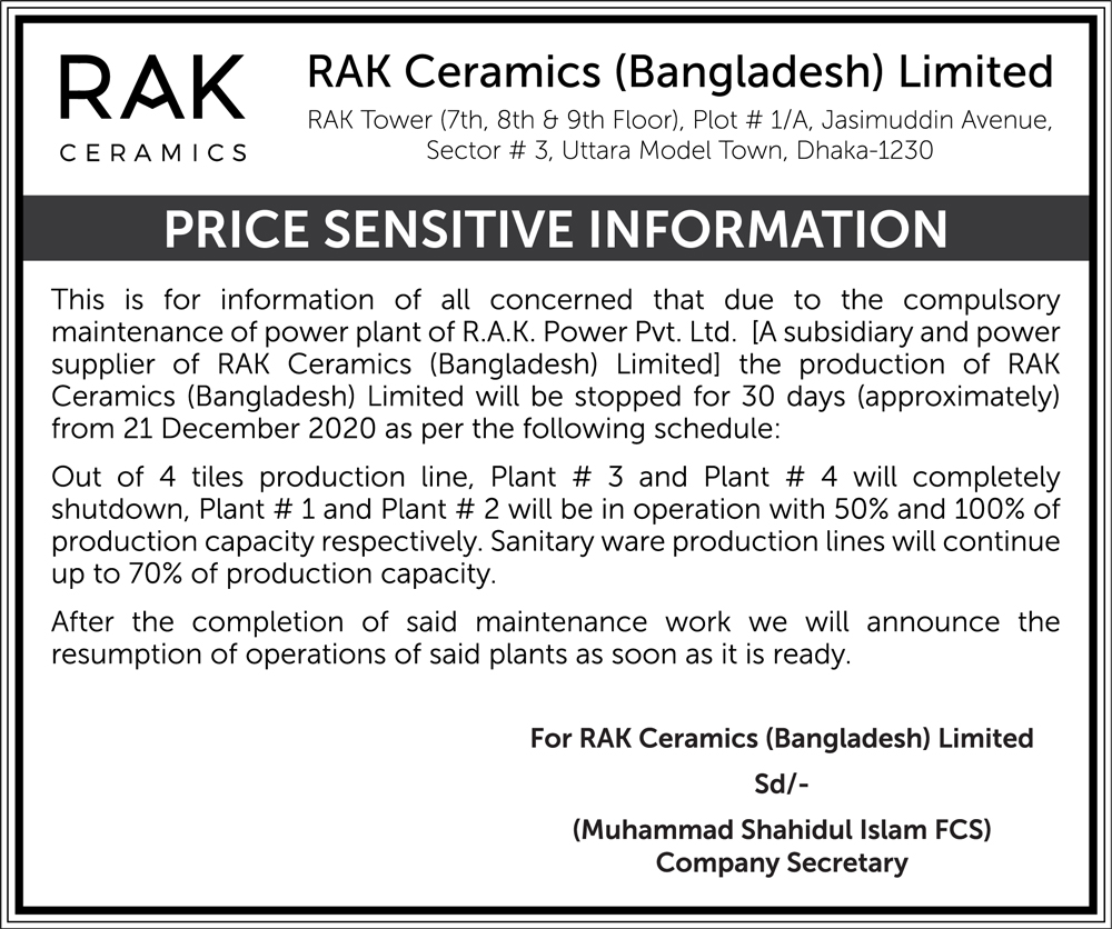 Price Sensitive Information of RAK Ceramics (Bangladesh) Limited