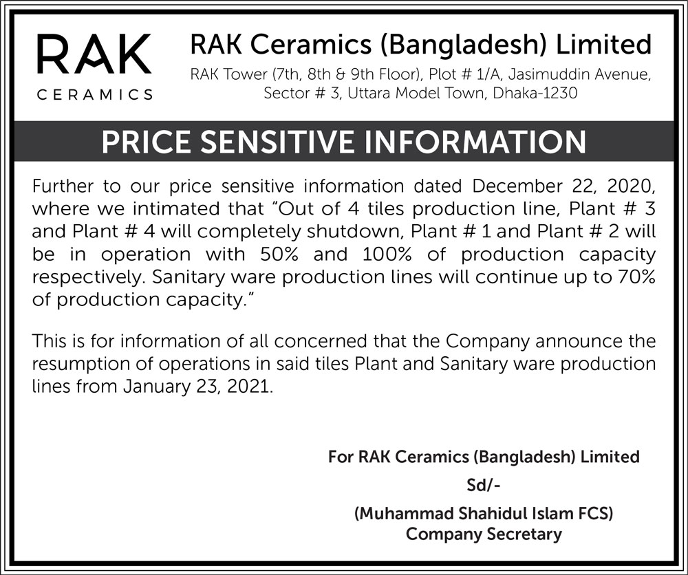 Price Sensitive Information of RAK Ceramics (Bangladesh) Limited