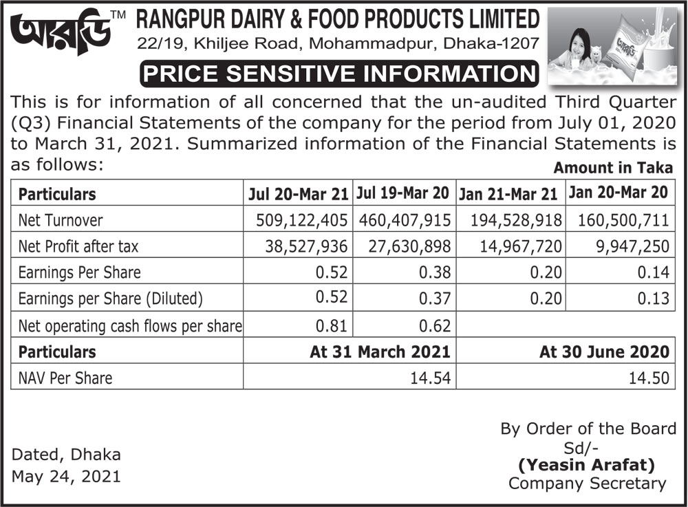 Rangpur Dairy & Food Products Limited Price Sensitive Information