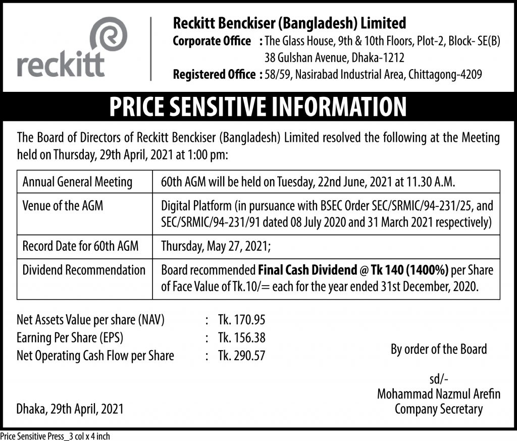 Price Sensitive Information Of Reckitt Benckiser (Bangladesh) Limited