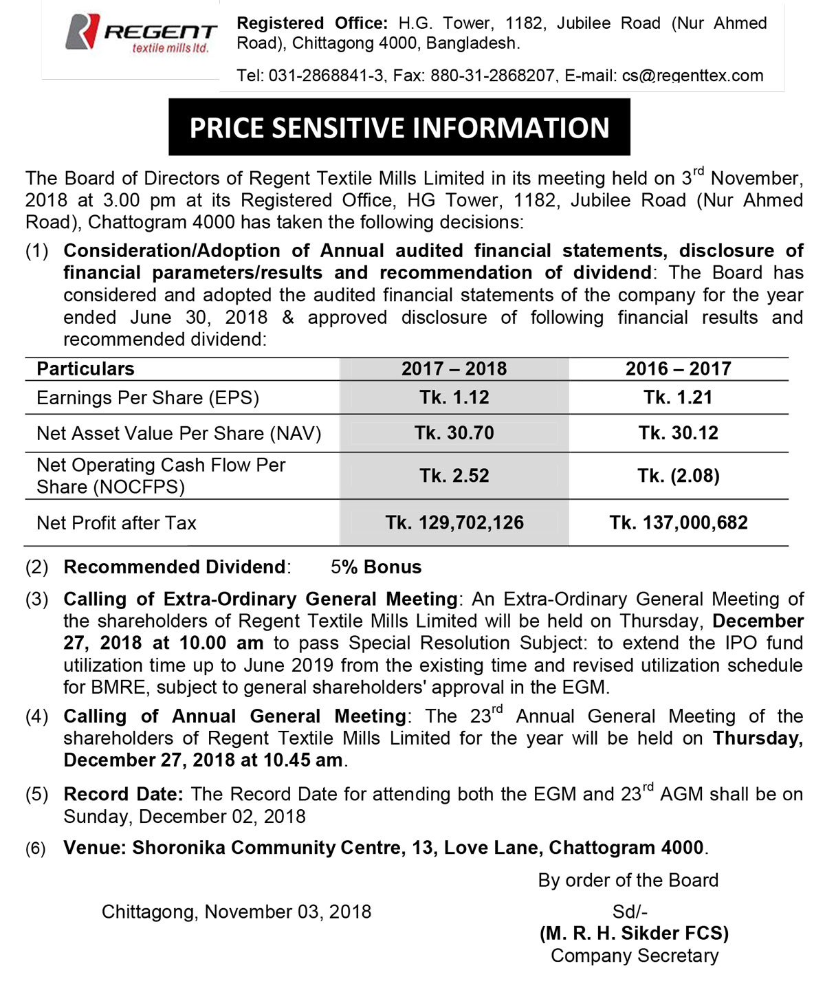Price Sensitive Information of Regent Textile Mills Limited