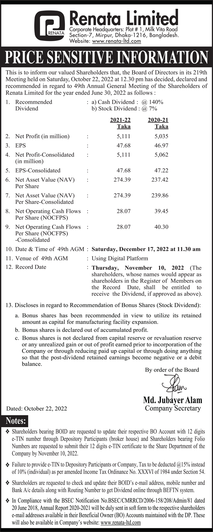 Price Sensitive Information of Renata PLC.