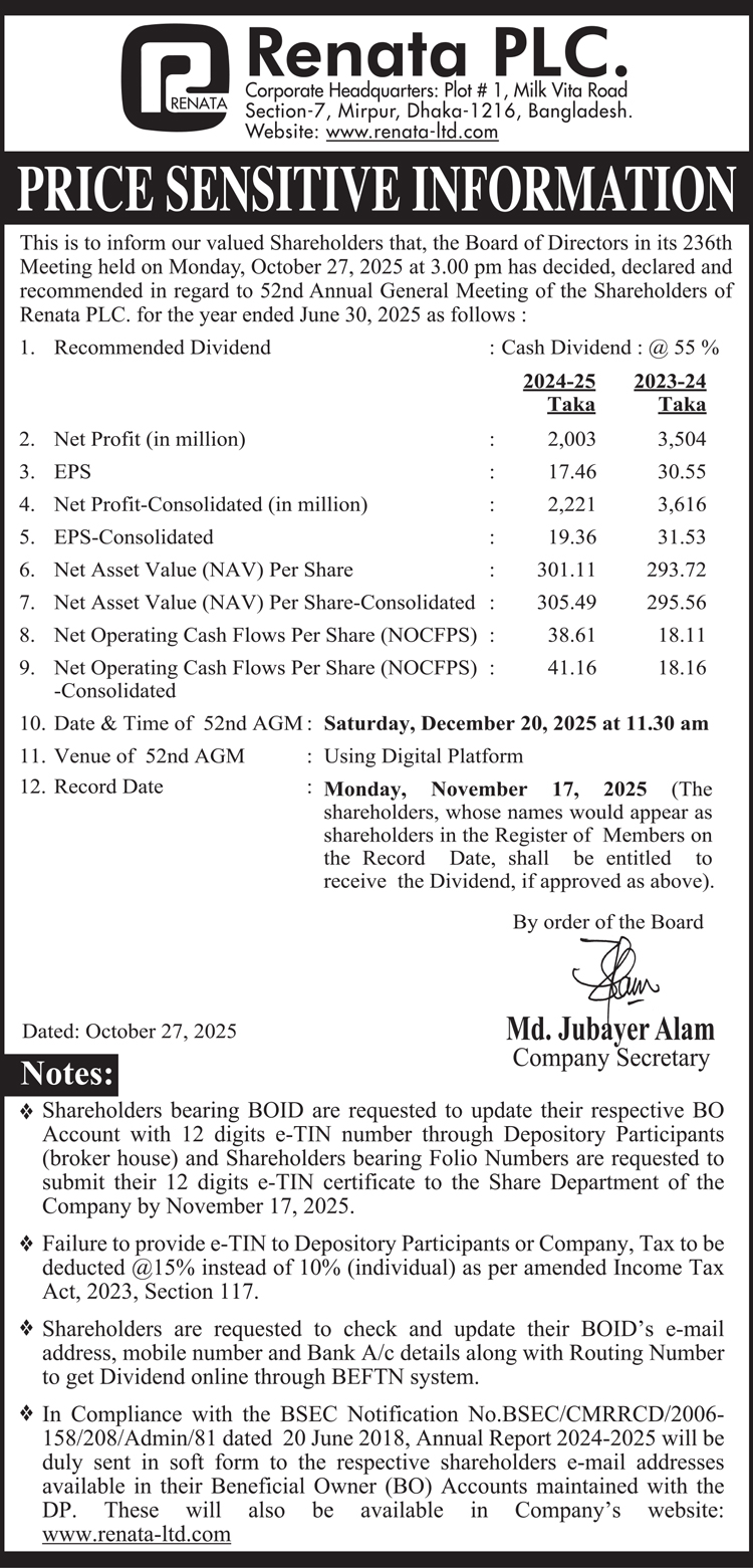 Half Yearly (Q2) Financial Statements (Unaudited) of Renata Limited