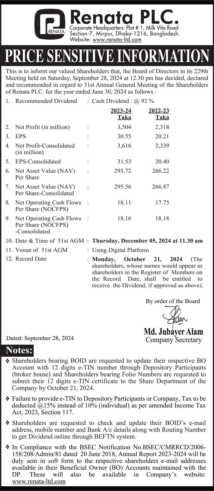 Price Sensitive Information of Renata PLC.