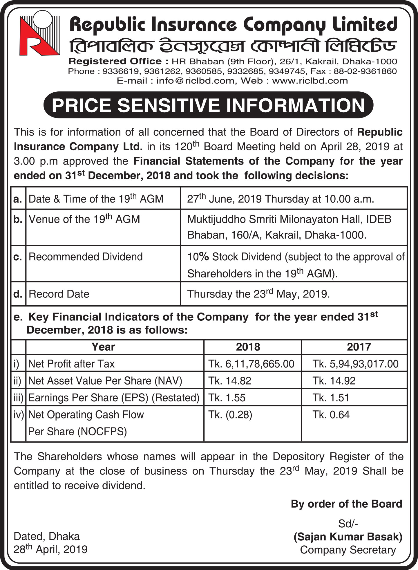 Price Sensitive Information relating to the 18th Annual General Meeting of Republic Insurance Company Ltd.