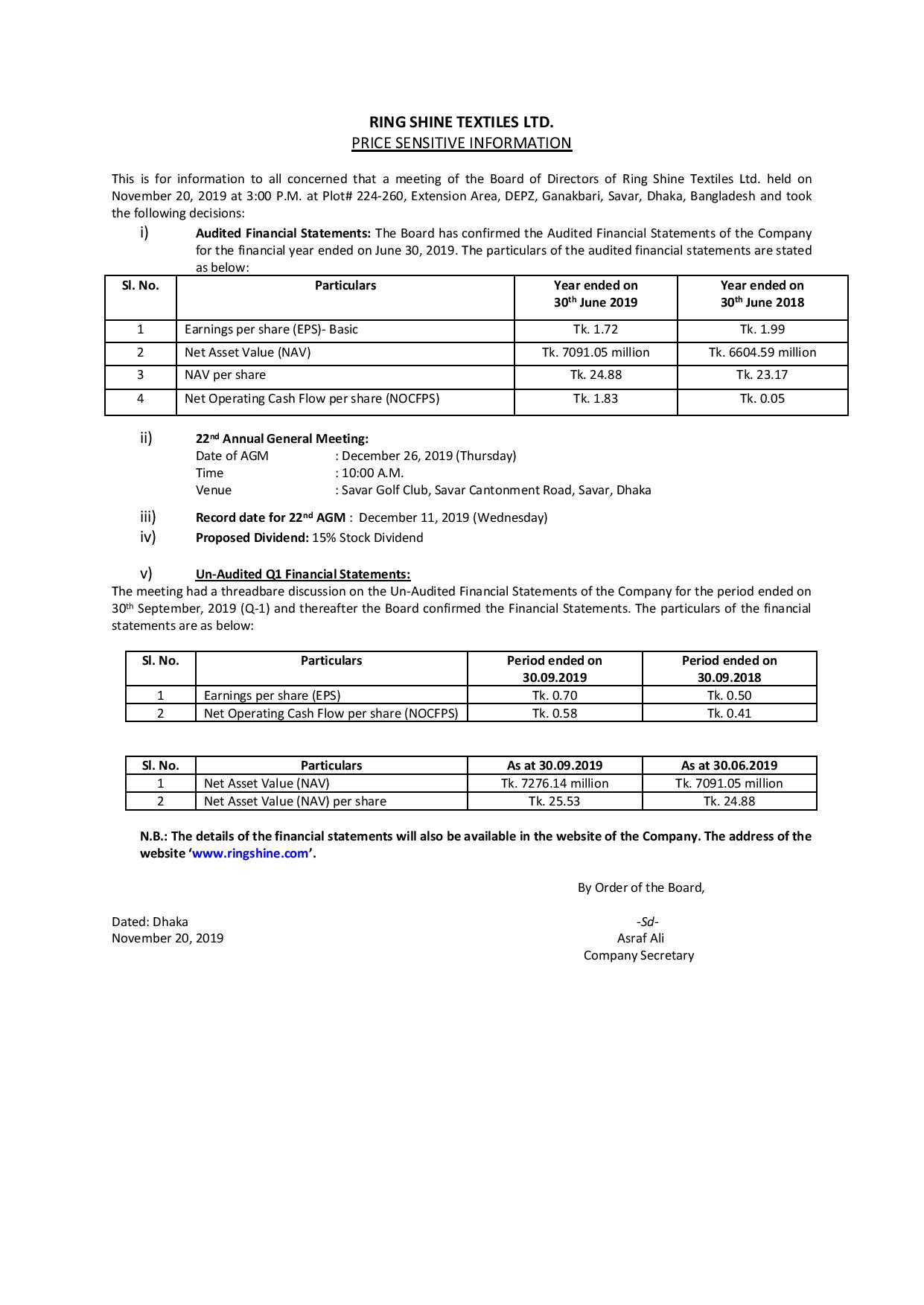 Price Sensitive Information of Ring Shine Textile Ltd.