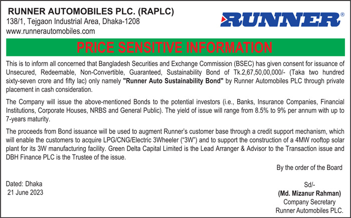 Price Sensitive Information of Runner Automobiles PLC.