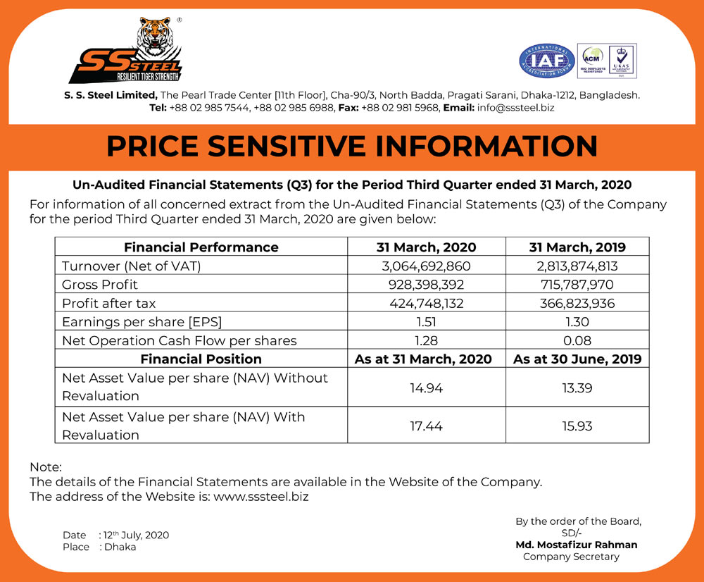 Price Sensitive Information (Q2) of S.S. Steel Limited