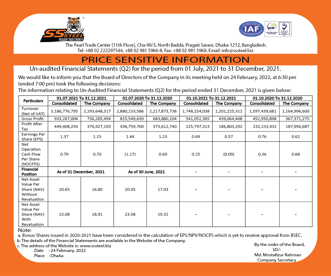 Price Sensitive Information (Q2) of S.S. Steel Limited