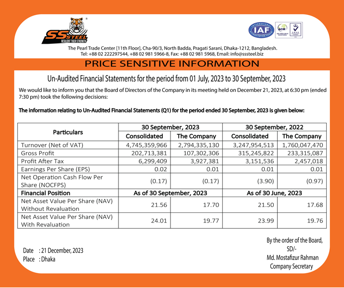 Price Sensitive Information (Q2) of S.S. Steel Limited