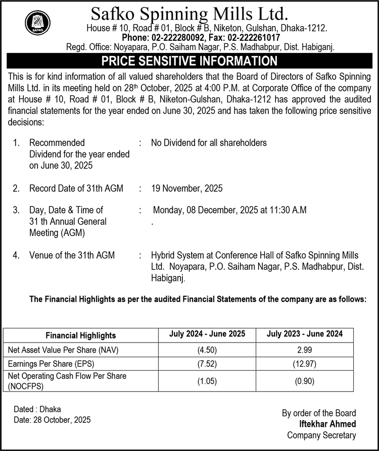 Price Sensitive Information of SAFKO Spinning Mills Ltd