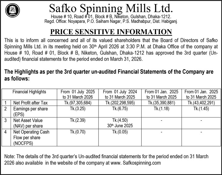 Price Sensitive Information of Safko Spinning Mills Limited