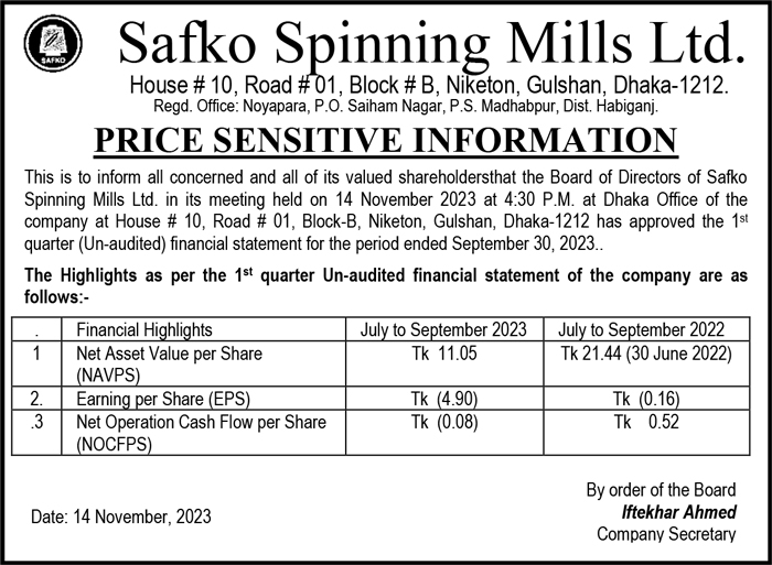 Price Sensitive Information of SAFKO Spinning Mills Ltd