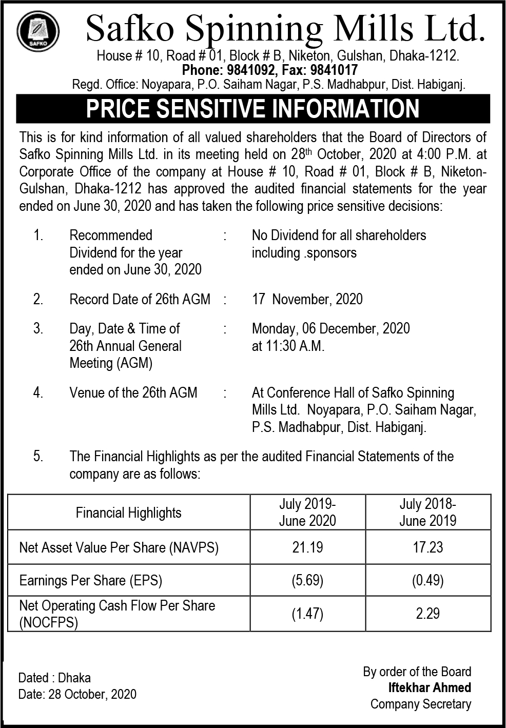 Price Sensitive Information of SAFKO Spinning Mills Ltd
