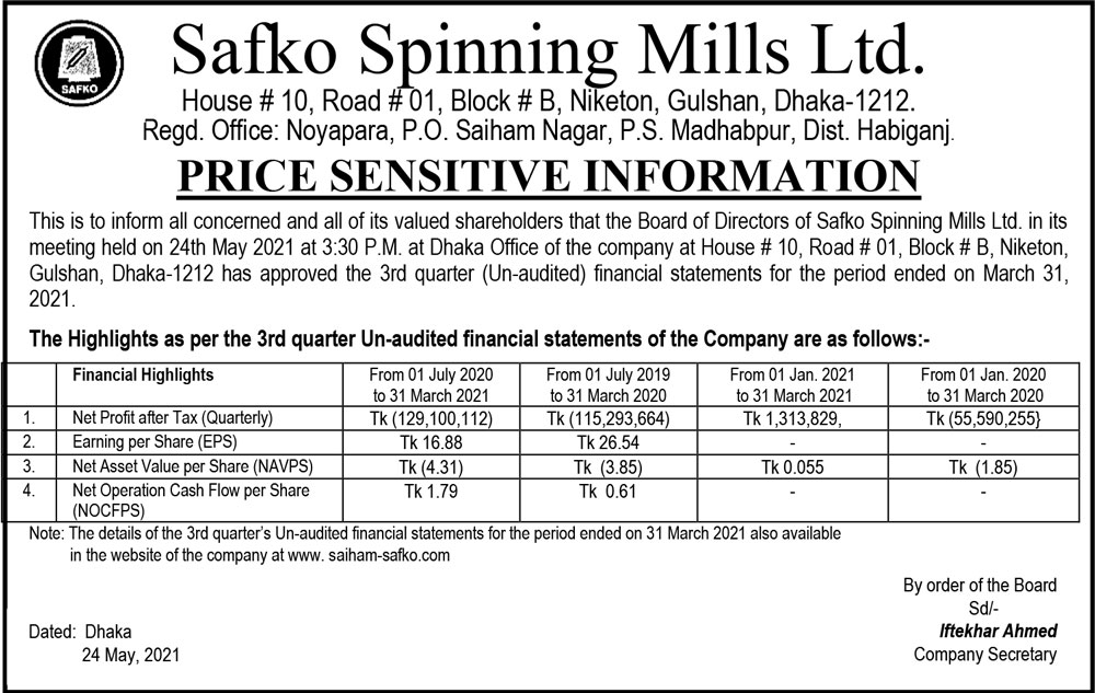 Price Sensitive Information of SAFKO Spinning Mills Ltd