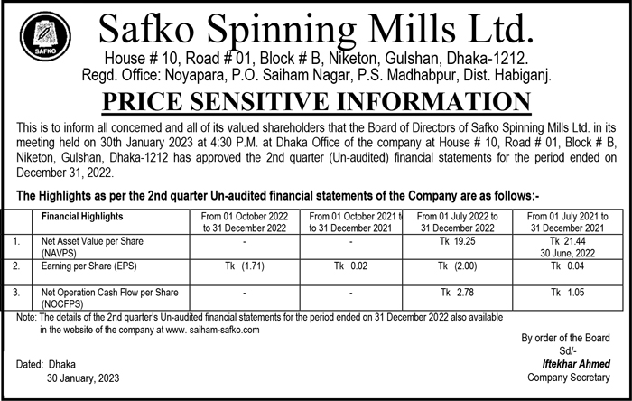Price Sensitive Information of SAFKO Spinning Mills Ltd