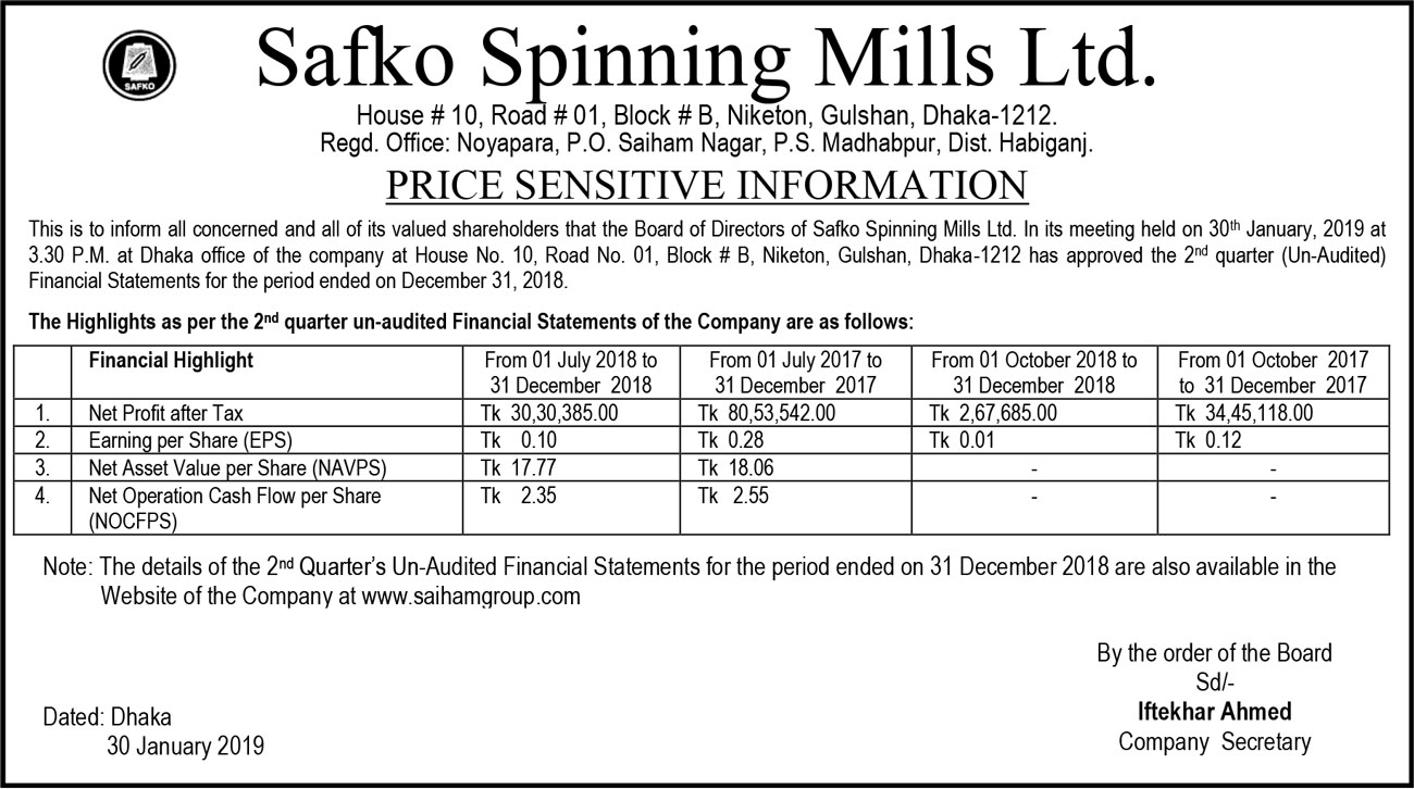 Price Sensitive Information of SAFKO Spinning Mills Ltd