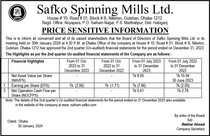 Price Sensitive Information of SAFKO Spinning Mills Ltd