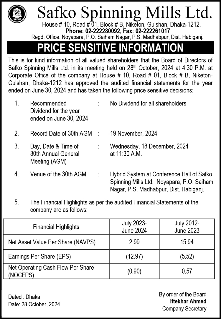 Price Sensitive Information of SAFKO Spinning Mills Ltd