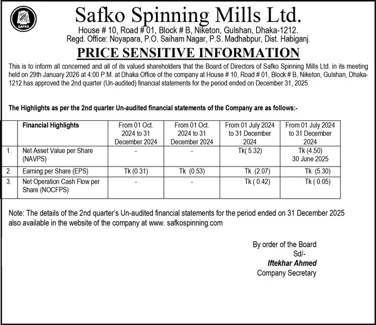 Price Sensitive Information of SAFKO Spinning Mills Ltd