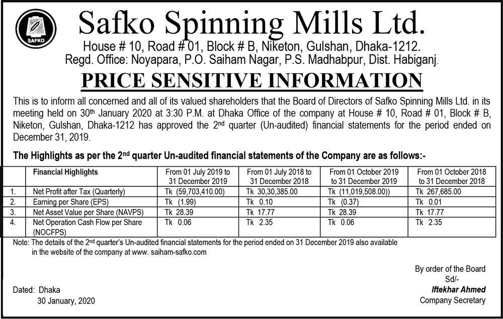 Price Sensitive Information of SAFKO Spinning Mills Ltd