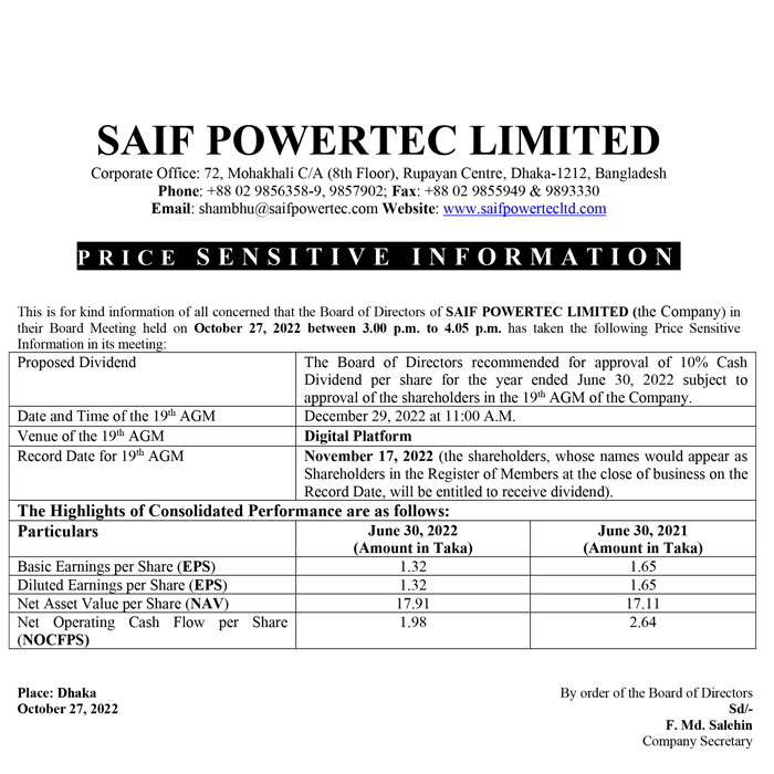 Price Sensitive Information of SAIF Powertec Limited