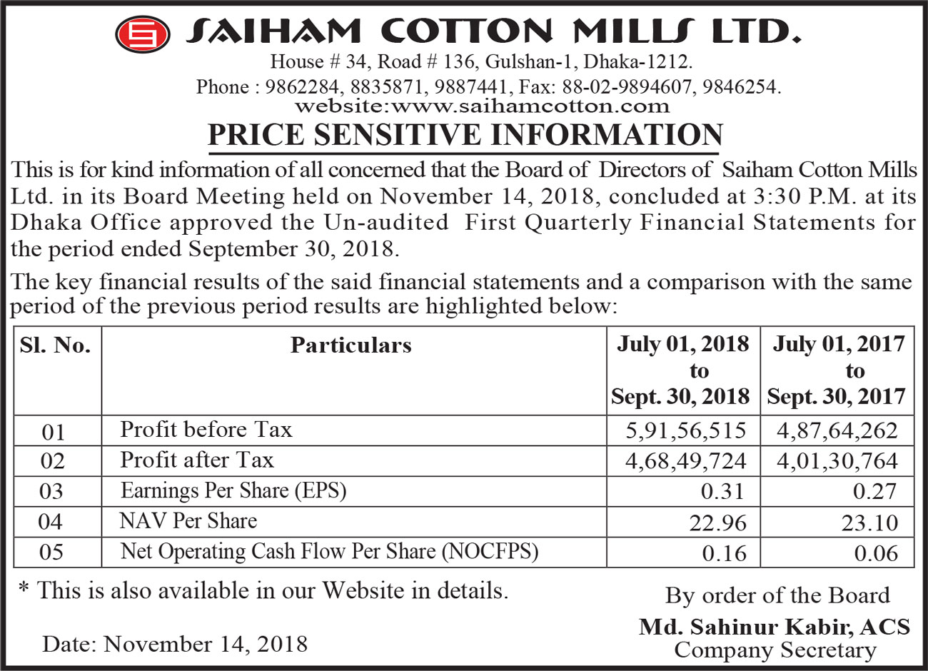 Price Sensitive Information of Saiham Cotton Mills Limited