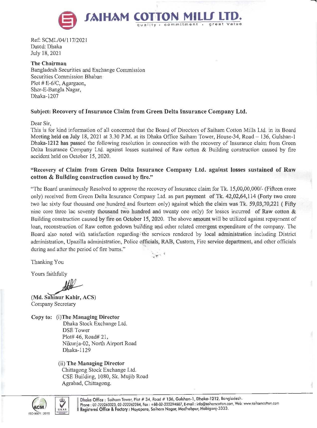 Recovery of Insurance Claim from Green Delta Insurance Company Ltd. of Saiham Cotton Mills Ltd.