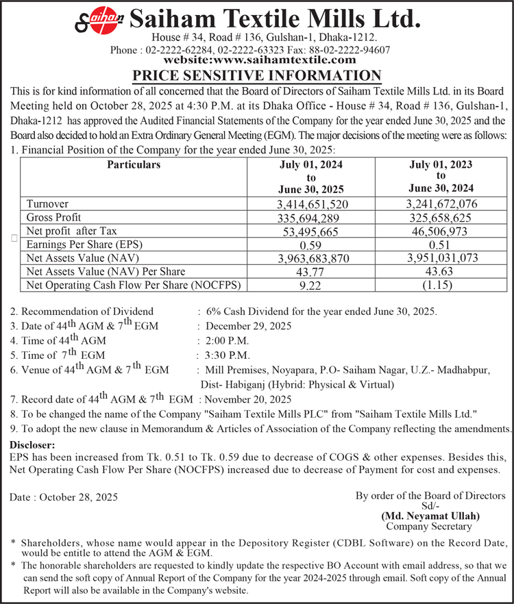 Price Sensitive Information of Saiham Textile Mills Ltd.