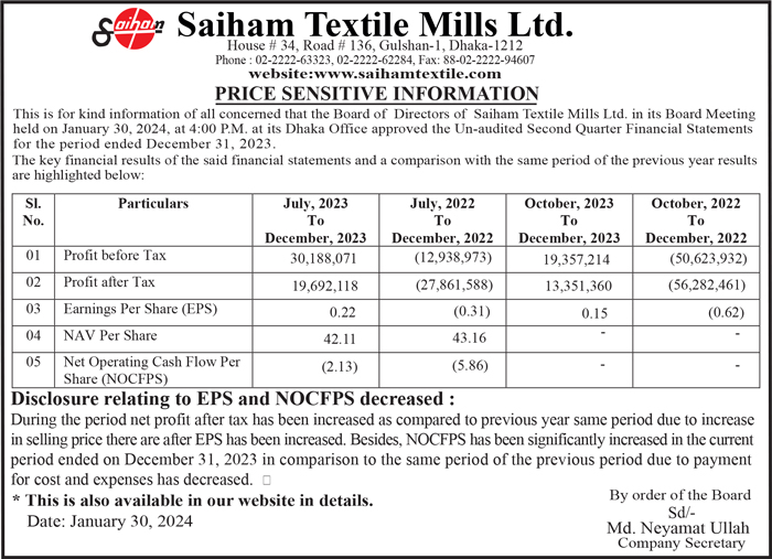 Price Sensitive Information of Saiham Textile Mills Ltd.