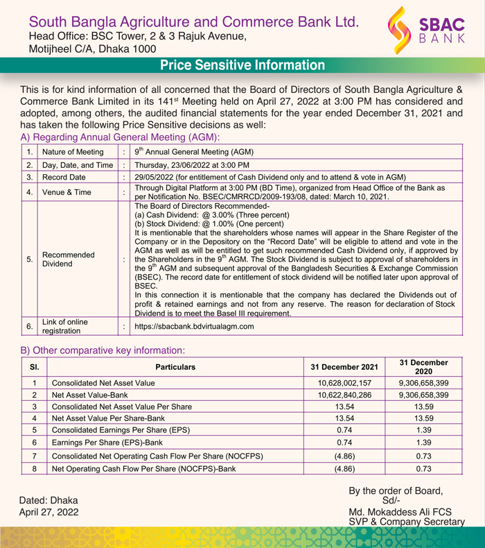 Price Sensitive Information (AGM) of SBAC Bank Limited