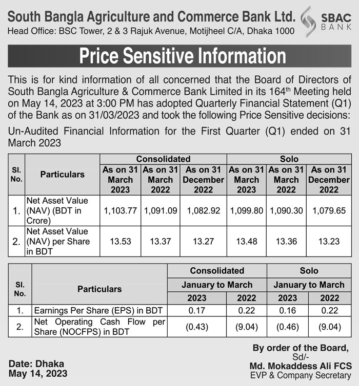 Price Sensitive Information of SBAC Bank