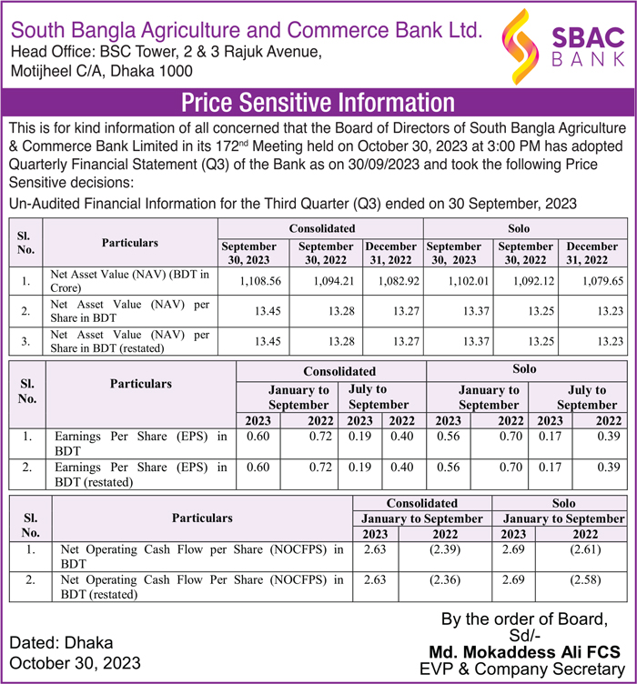 Price Sensitive Information (AGM) of SBAC Bank Limited