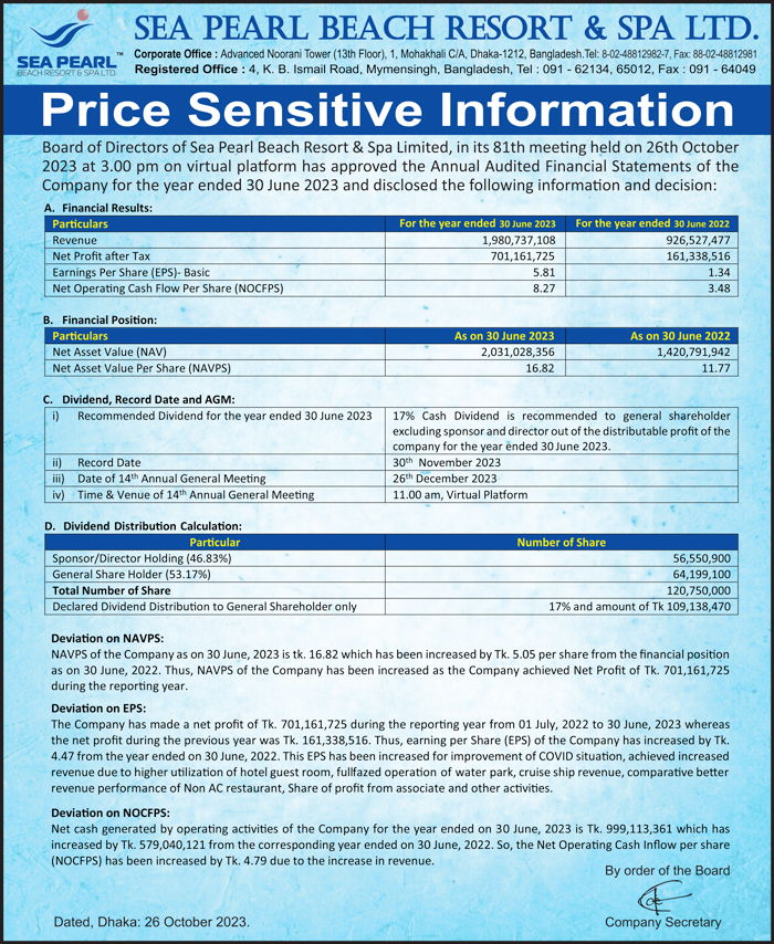 Price Sensitive Information of Sea Pearl Beach Resort & SPA Ltd.
