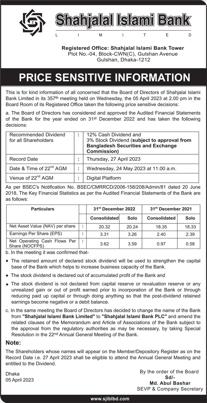 Price Sensitive Information of Shahjalal Islami Bank Limited