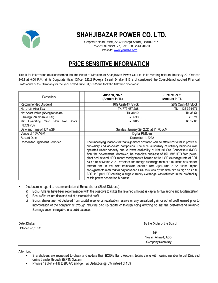 Price Sensitive Information of Shahjibazar Power Co. Ltd