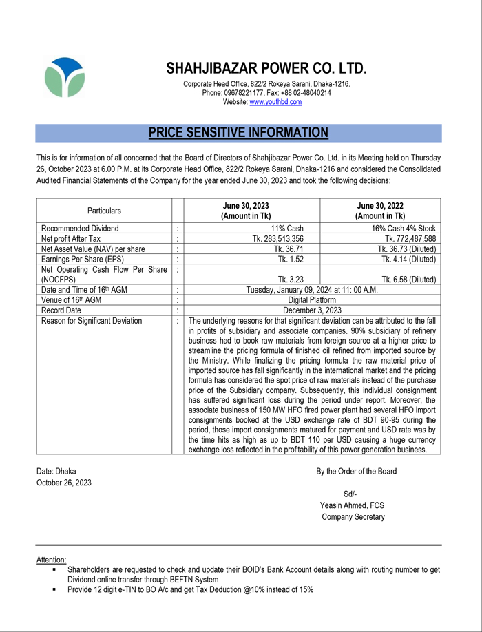 Price Sensitive Information of Shahjibazar Power Co. Ltd