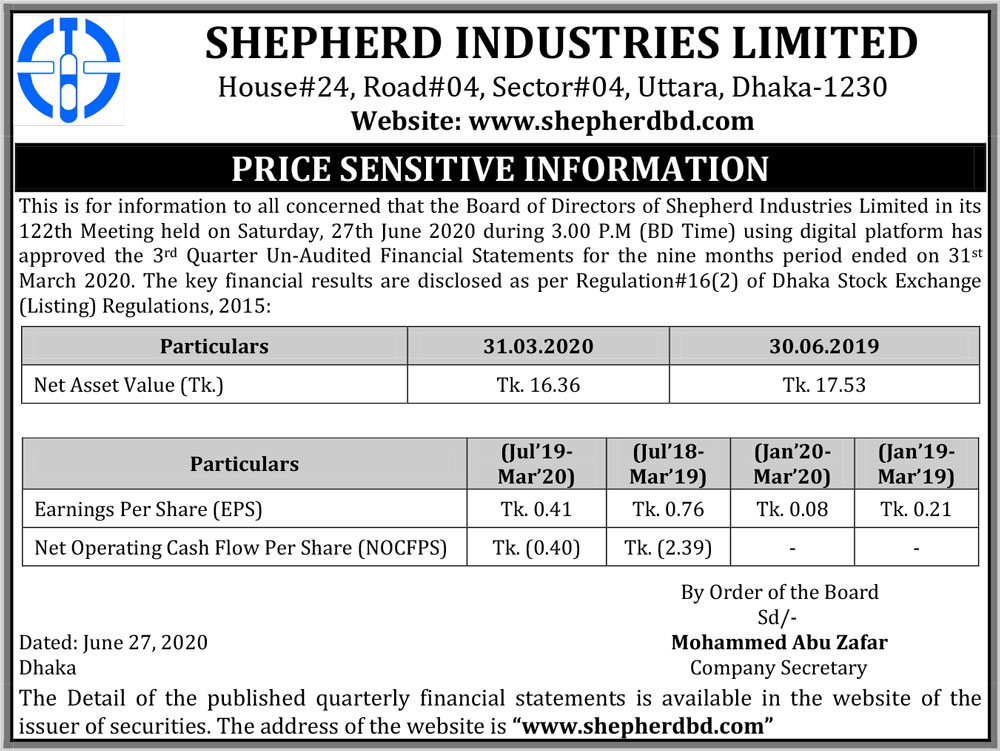 Price Sensitive information (Q3) of Shepherd Industries Ltd