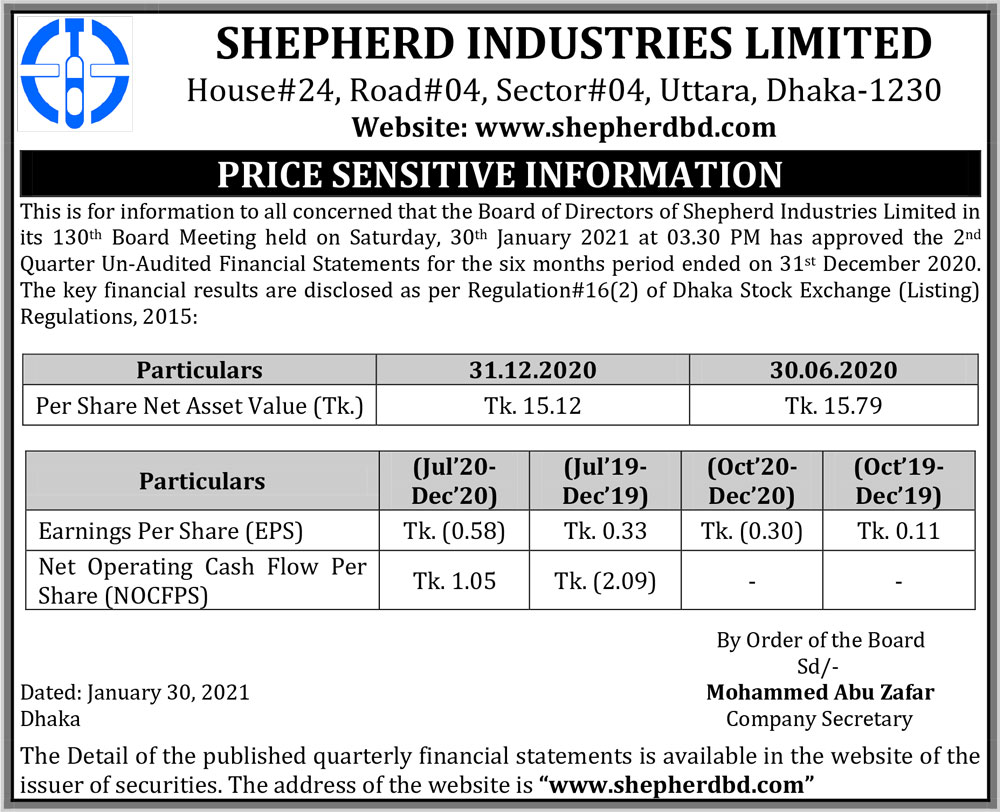 Price Sensitive information (Q3) of Shepherd Industries Ltd