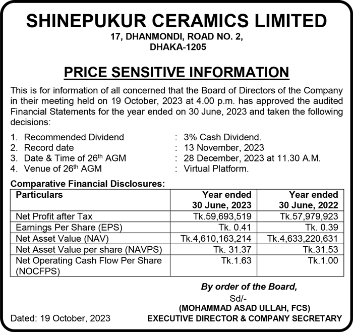 Price Sensitive Information of Shinepukur Ceramics Ltd.