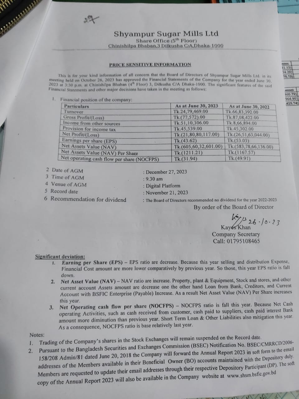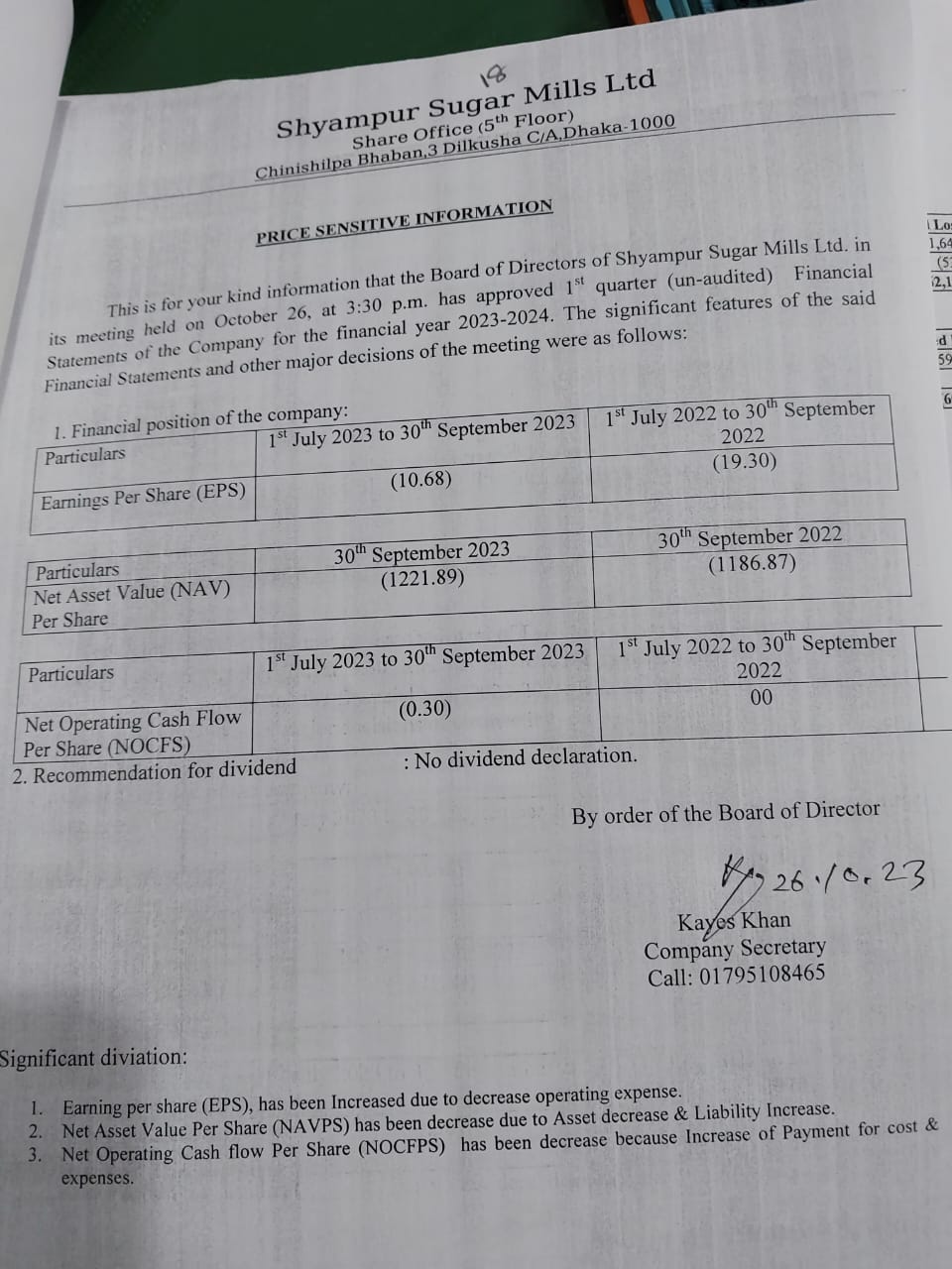 Price Sensitive Information of Shyampur Sugar Mills Ltd