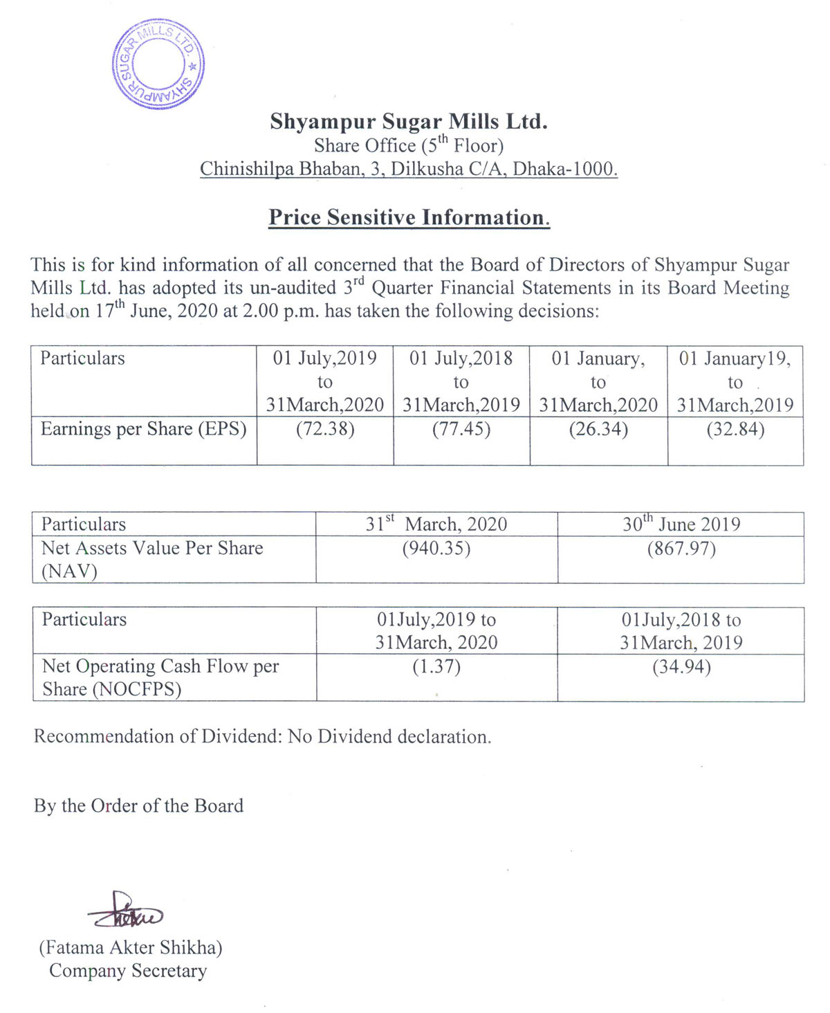 Price Sensitive Information of Shyampur Sugar Mills Ltd