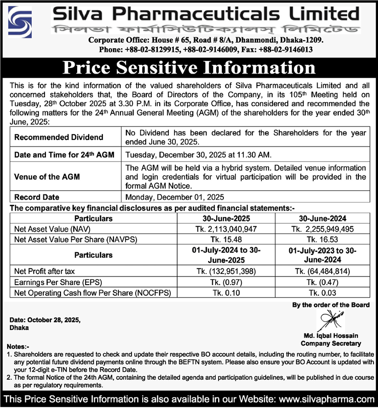 Price Sensitive Information of Silva Pharmaceuticals Limited