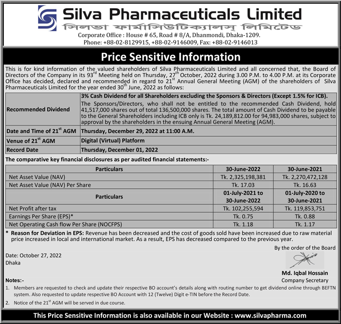 Price Sensitive Information of Silva Pharmaceuticals Limited