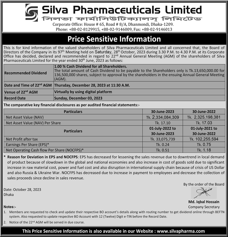 Price Sensitive Information of Silva Pharmaceuticals Limited