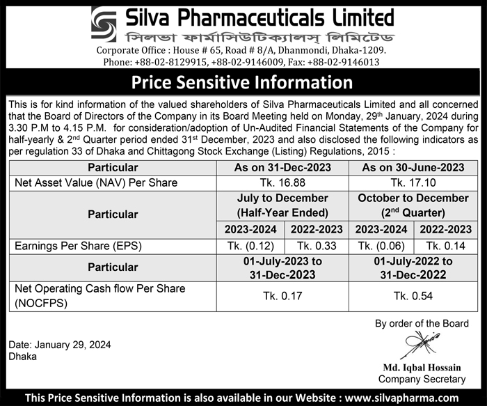 Price Sensitive Information of Silva Pharmaceuticals Limited