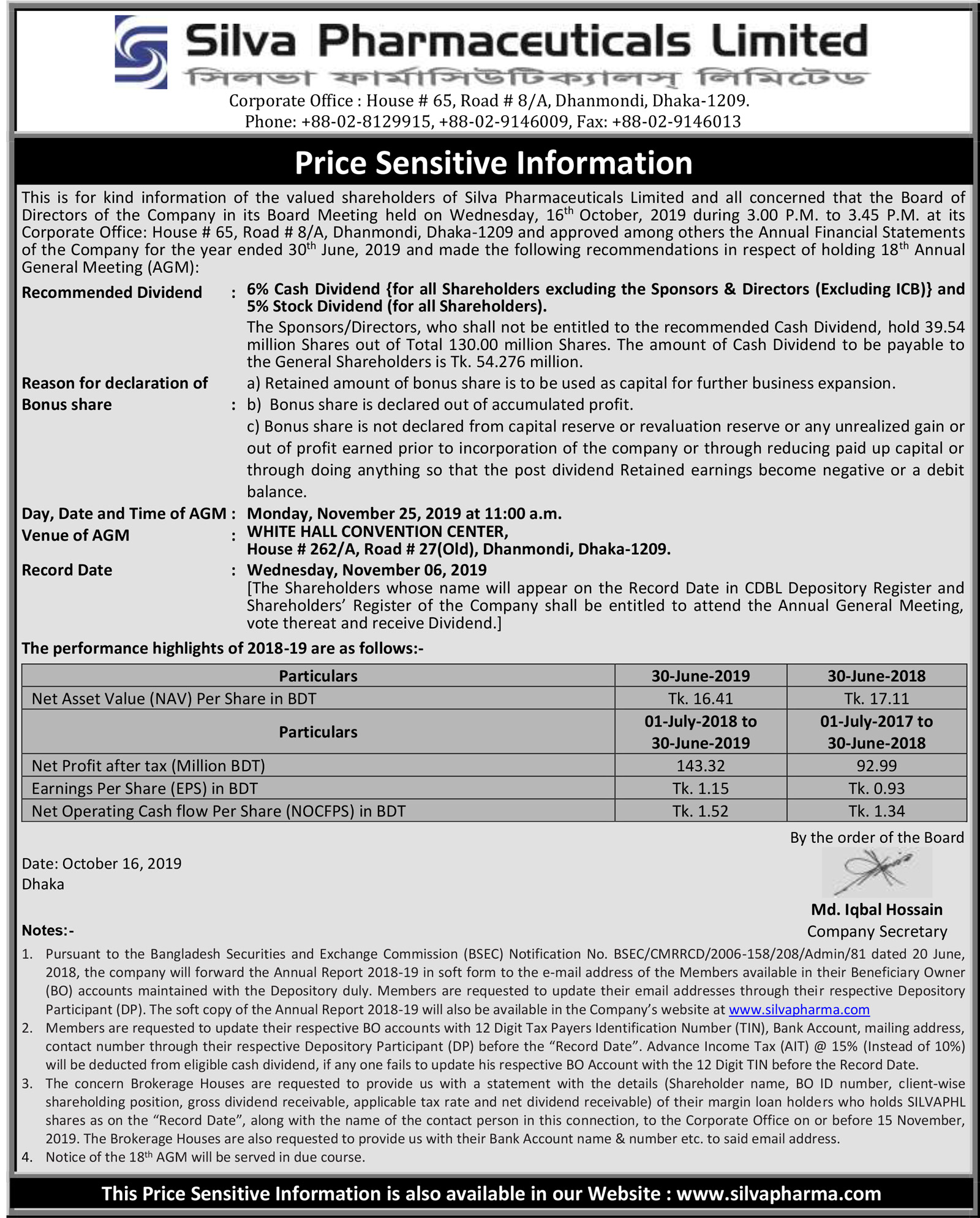 Price Sensitive Information of Silva Pharmaceuticals Limited