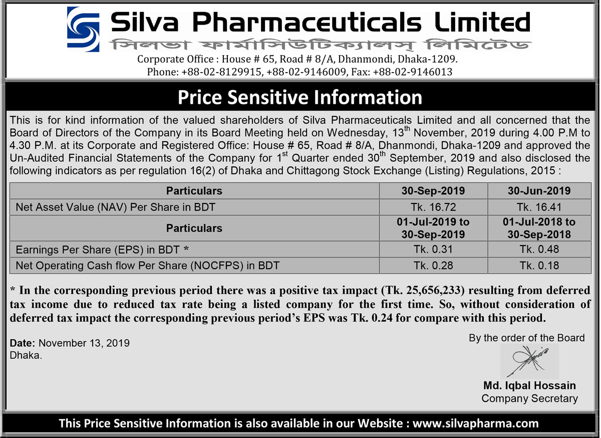 Price Sensitive Information of Silva Pharmaceuticals Limited