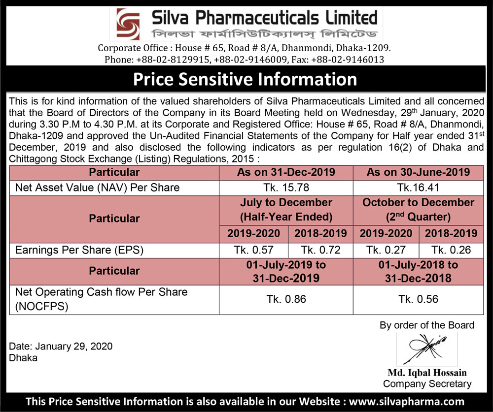 Price Sensitive Information of Silva Pharmaceuticals Limited