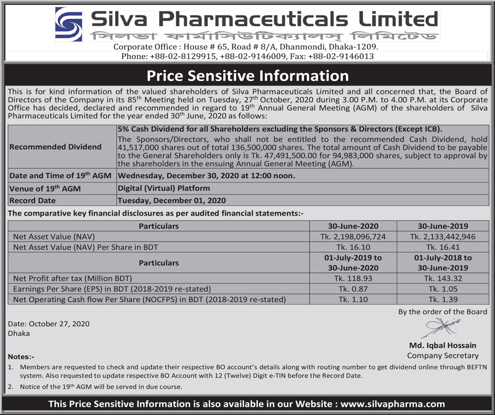 Price Sensitive Information of Silva Pharmaceuticals Limited